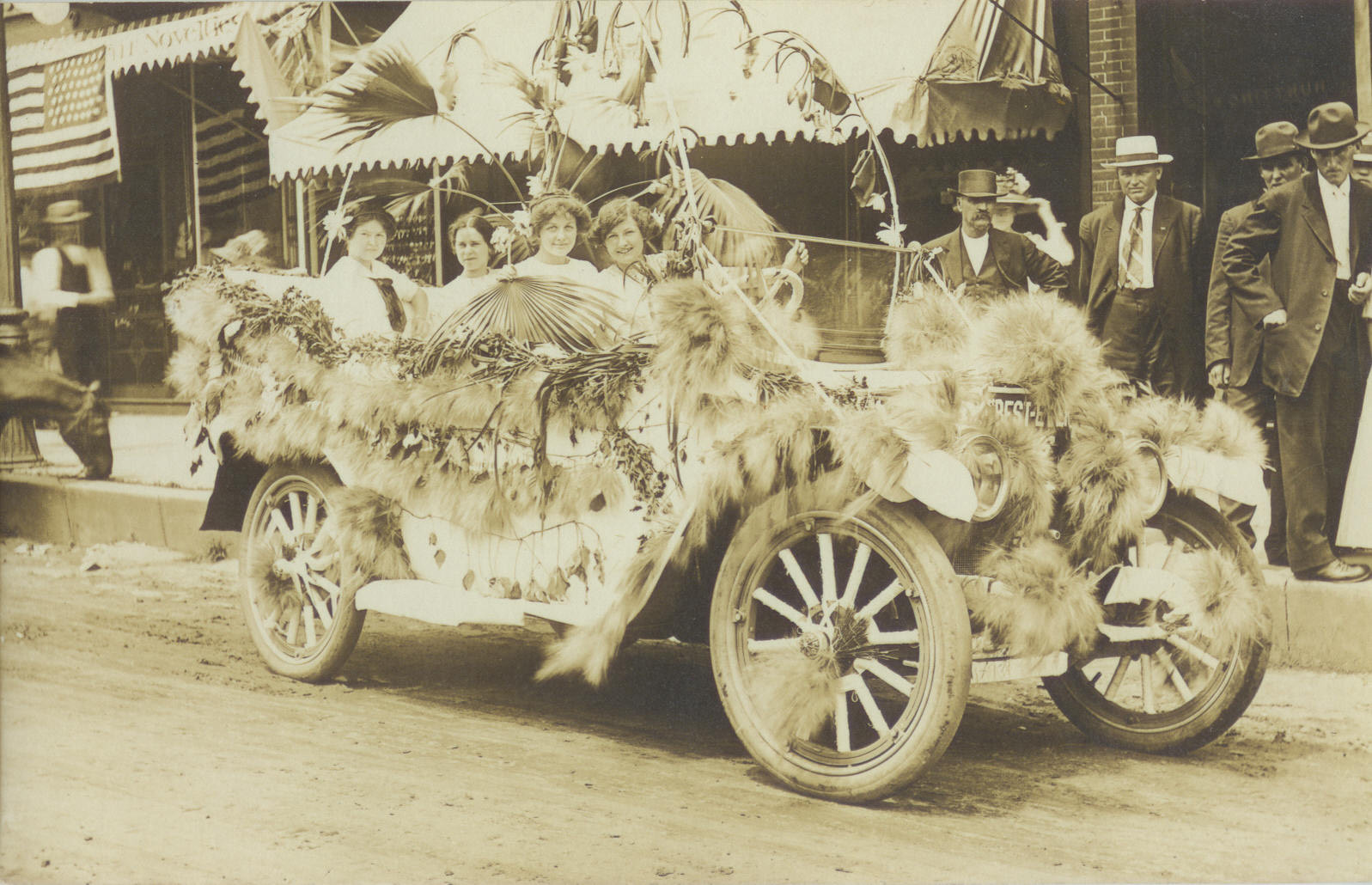 A car decked out in feathers and palm fronds glided through the streets in 1918.