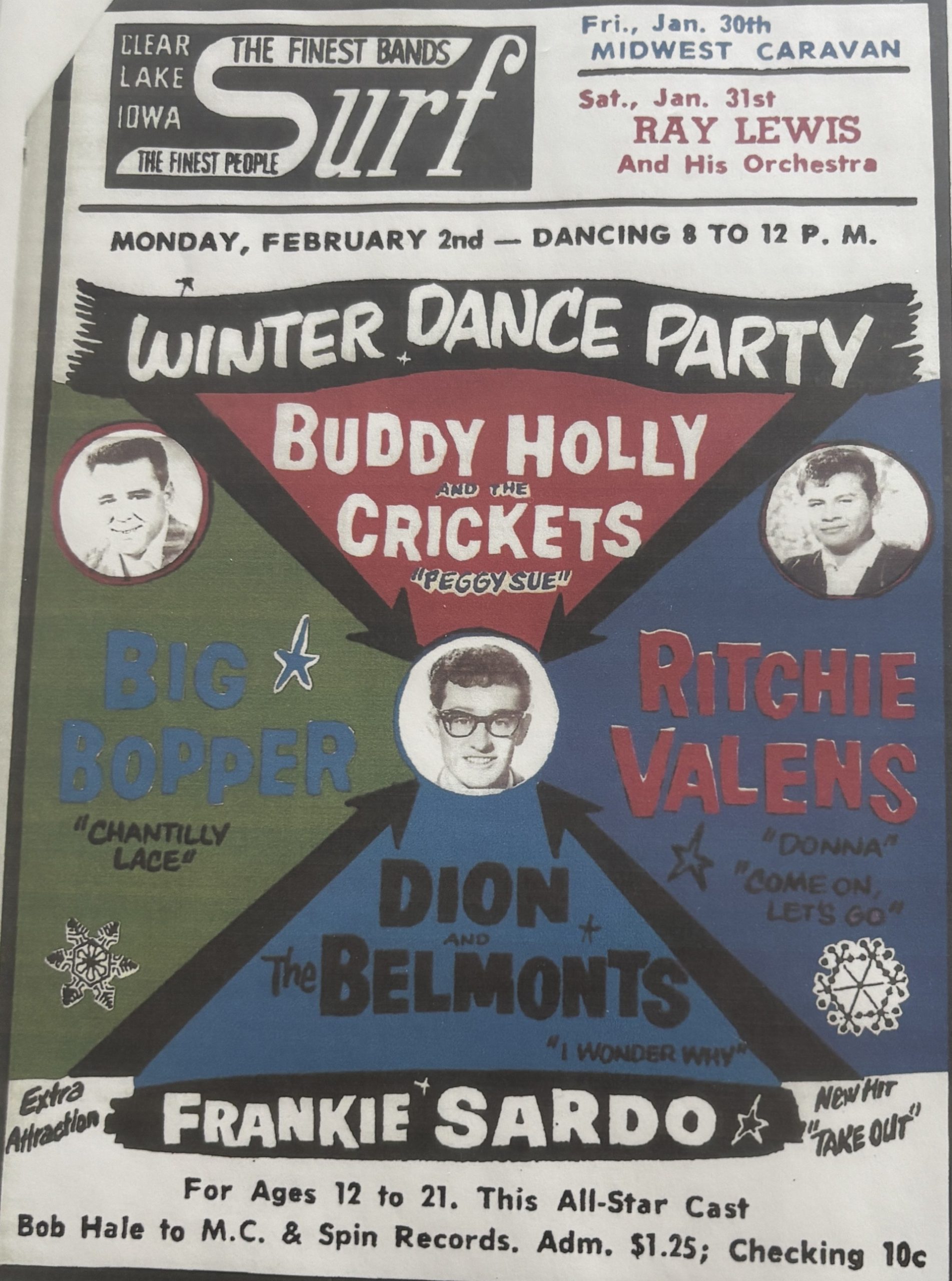 Rock and roll stars, Buddy Holly, Richie Valens and J.P. Richardson (The Big Bopper) and pilot Roger Peterson were killed in a plane crash after leaving the Mason City – Clear Lake airport. They had just finished their performance at the Surf Ballroom were heading for a play date in South Dakota. A marker is displayed in the rural area where the plane crashed.